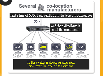 | If the host of any customer is virus-infected, it is very easy to cause mutual attacks and then result in network meltdown or the significant effect on network performance. Moreover, if the switch of the host manufacturer is down, or the gigaport has something wrong, switch giga cannot be released, switch or bandwidth is down, all these will cause the dedicated server networks of all customers under each host manufacture being affected, which will then make the network disconnected with Internet. |